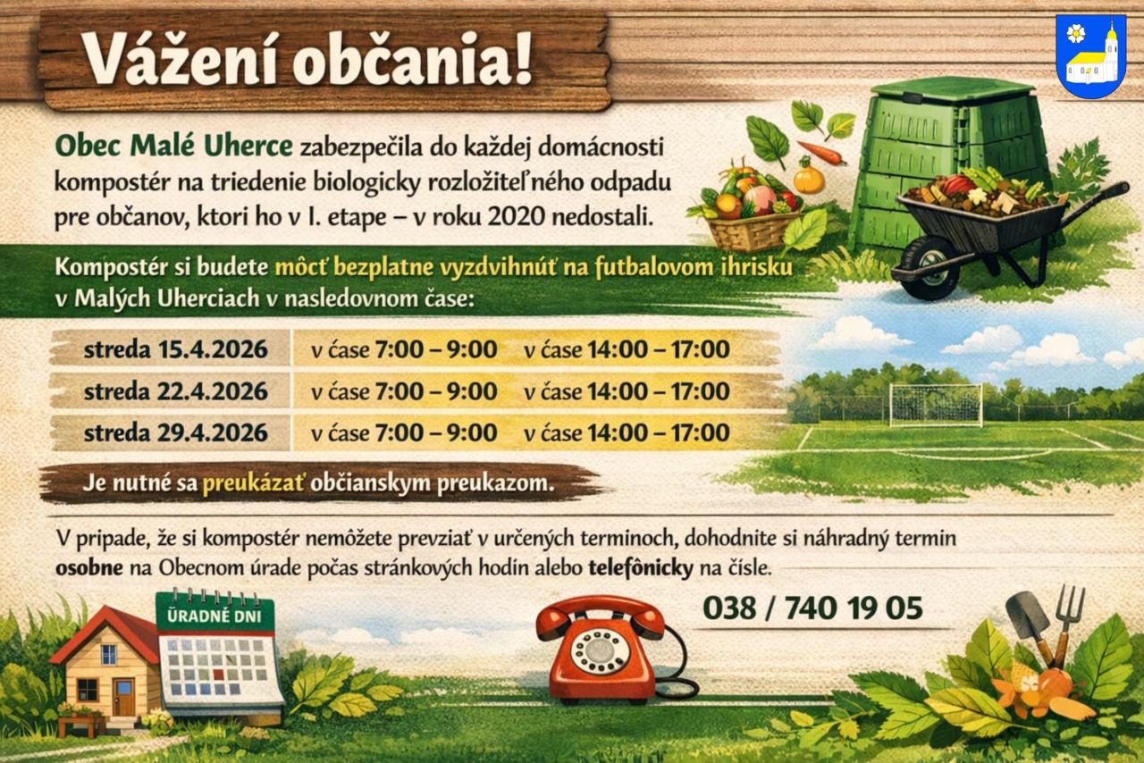 Obec Malé Uherce zabezpečila do každej domácnosti kompostéry na triedenie biologicky rozložiteľného odpadu. Tento krok bol realizovaný pre tých, ktorí si kompostér neprevzali v I.etape v roku 2020. Kompostéry bude možné vyzdvihnúť na futbalovom ihrisku v Malých Uherciach v predpísaných termínoch. Je dôležité sa preukázať občianskym preukazom. V prípade, že si kompostér nemôžete prevziať v určených časoch, je možné dohodnúť si náhradný termín osobne na Obecnom úrade alebo telefonicky.