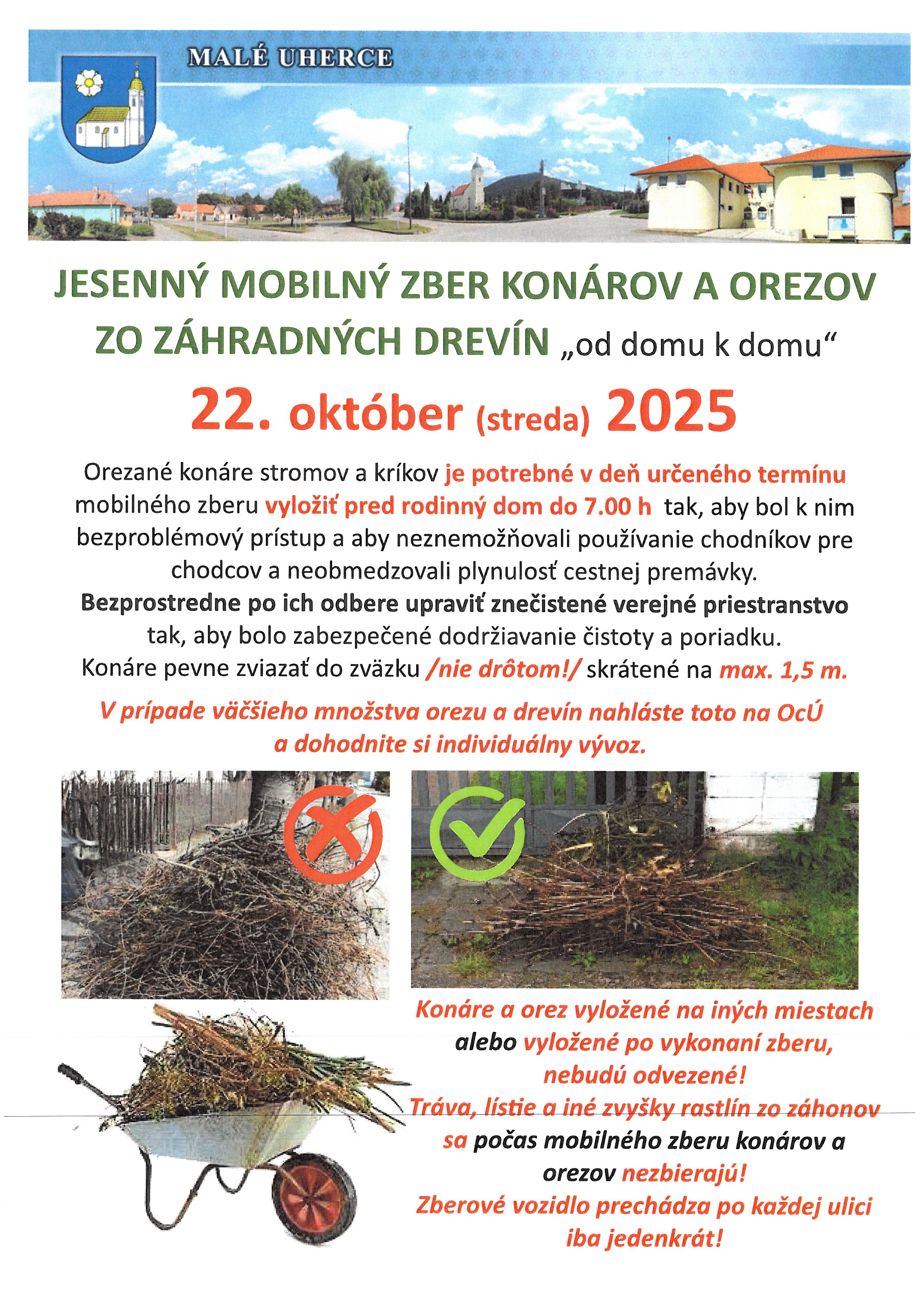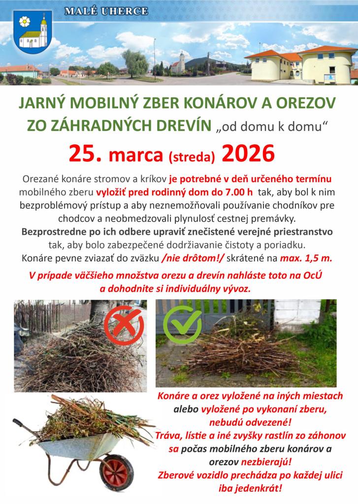 Mobilný zber orezaných konárov a drevín sa uskutoční dňa 25.03.2026. Žiadame občanov, aby konáre vyložili pred rodinné domy do 7.00 hod., pričom je dôležité zabezpečiť bezproblémový prístup a neobmedzovať chodcov ani cestnú premávku. Konáre je potrebné zviazať do zväzkov s maximálnou dĺžkou 1,5 m a dbať na čistotu vo verejných priestranstvách po odbere. V prípade väčšieho množstva orezu je potrebné nahlásiť to na obecný úrad a dohodnúť si individuálny vývoz. Zberové vozidlo prechádza po každej ulici iba raz, preto je dôležité dodržiavať uvedené pokyny.