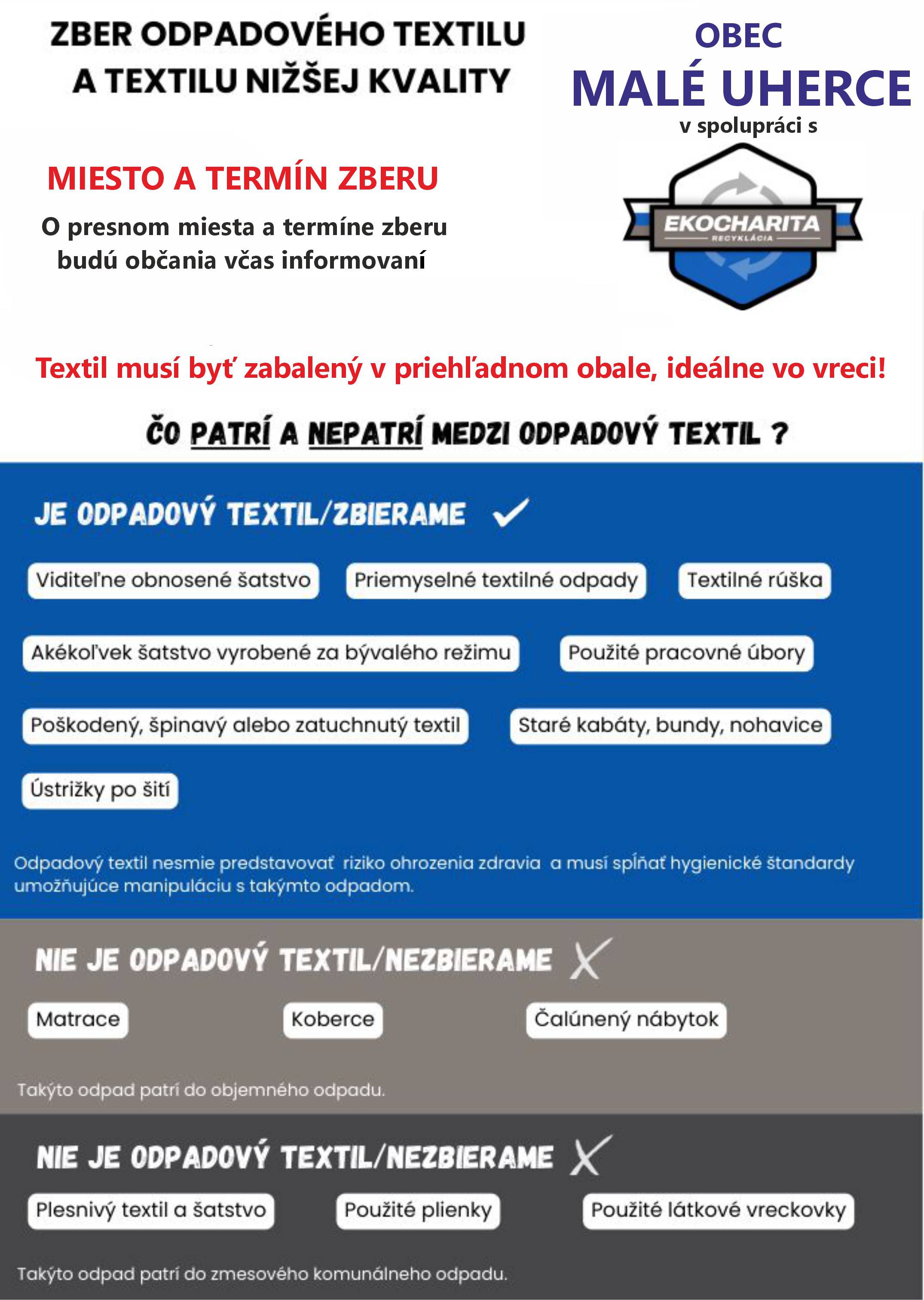 Od 1. januára 2025 majú obce povinnosť zabezpečiť zavedenie a vykonávanie triedeného zberu komunálnych odpadov pre textil. Obec MALÉ UHERCE v spolupráci so spoločnosťou EKOCHARITA, bude zabezpečovať zber textilu v našej obci formou sezónneho zberu (tak ako zber veľkoobjemového odpadu) min 2x do roka